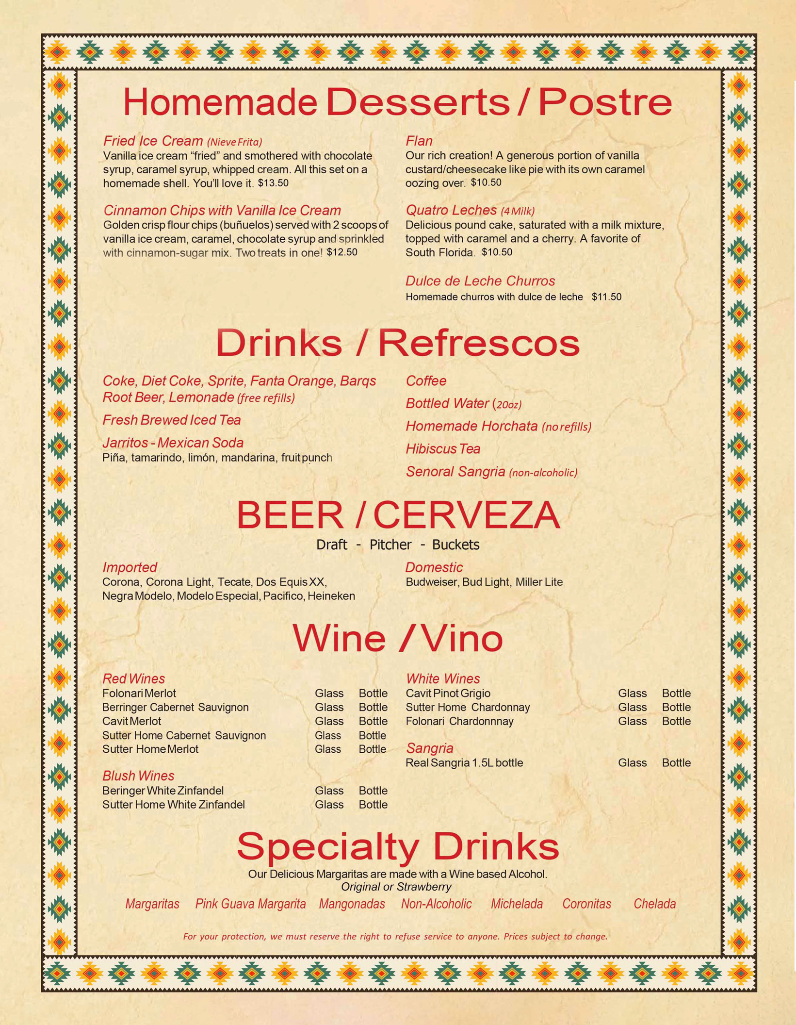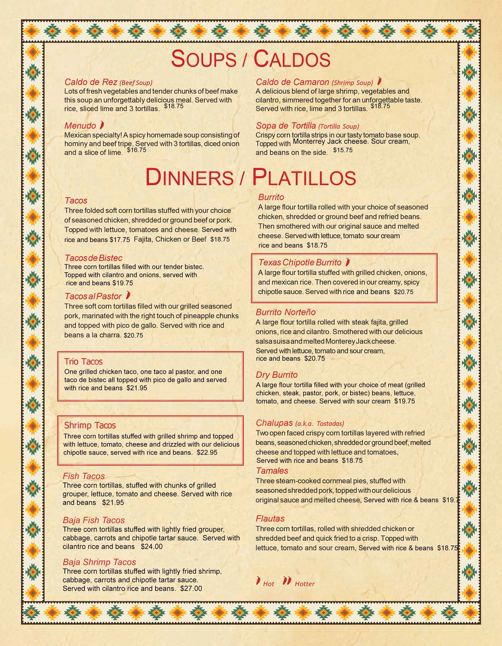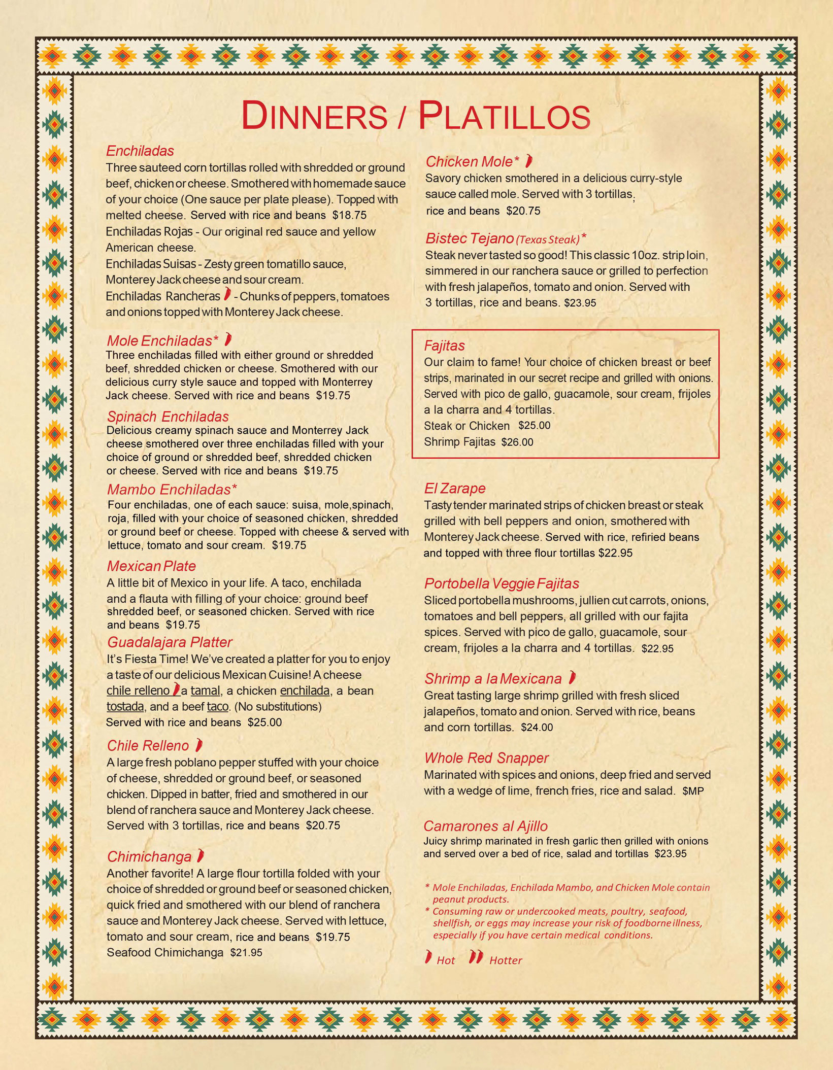 Our menu includes a variety of dishes made with care and tradition. House favorites include sizzling fajitas, Fajita Bite Nachos, Burrito Norteño, Bistec Tejano, and our popular Whole Red Snapper. You’ll also find tacos, soups, and salads—served fresh in a welcoming, casual space.